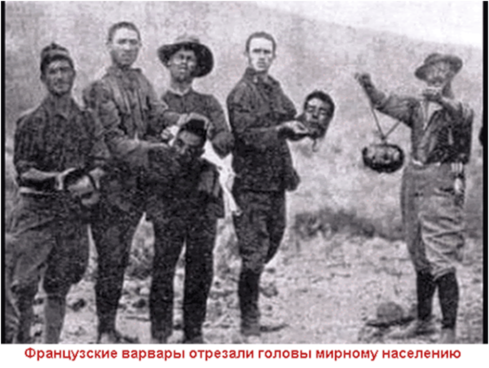 Французы безнаказанно уничтожали варварским методом тысячами представителей местного населения в различных своих колониальных странах. Отрезали головы и радостно демонстрировали это всему миру!